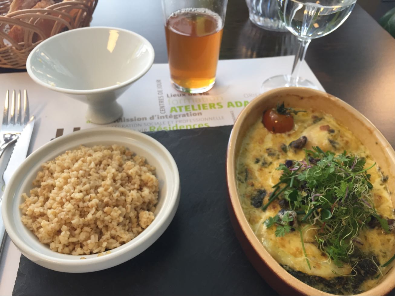 ウロウロしてるうちに、ようやく大きな道路に出て、パティスリーやブラッスリーのあるところに戻ってきました。もう1時になる。歩き回ってお腹もぺこぺこです。ようやくちょっとオシャレなカフェレストランに入ることができました。