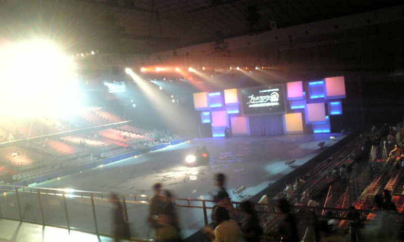 千秋楽入場しました。今度は同じ2階西スタンドの四列目。さっきより少しだけリンクに近くなります。しかしこの会場、正面一階は音響さんとテレビクルーだけなのね。めちゃめちゃ観客に不親切な席設定だわ(^_^;)。
