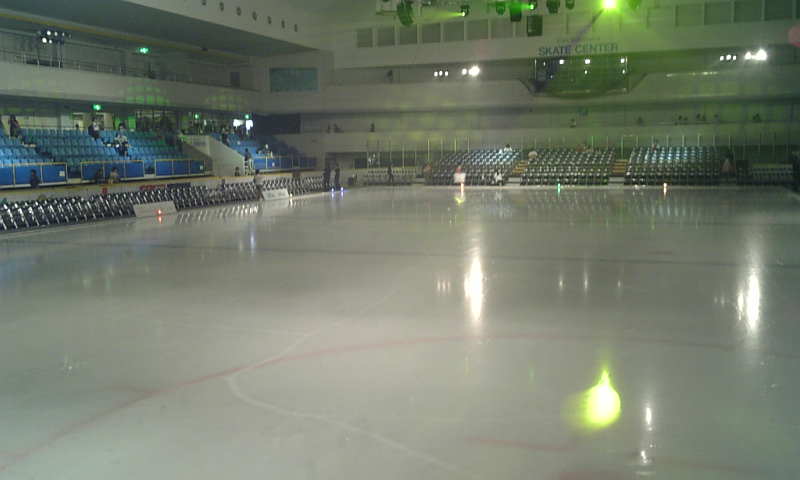 オープニング、今年の照明は凝ってます。レーザー光線でスケーターの名前が順番に描かれ、今回の出演スケーターが北側から全員登場。東側に向かって退場して行きます。
