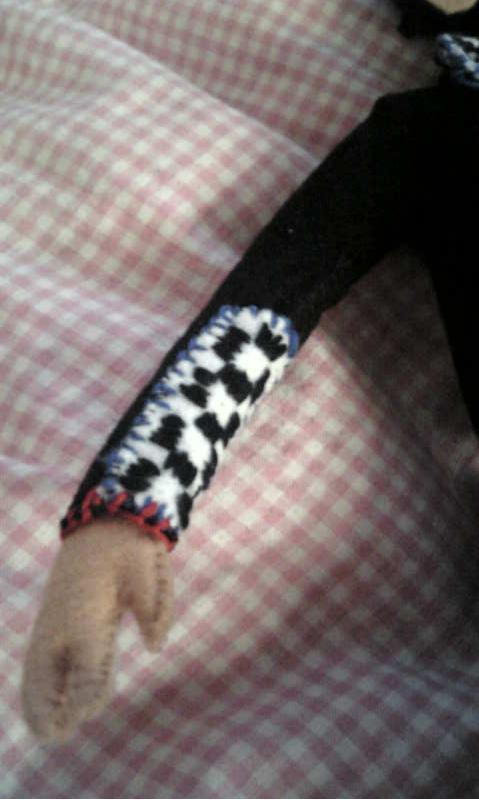 上着は白と赤の糸でアクセント。下のベストっぽいところにはビーズもつけてみました。