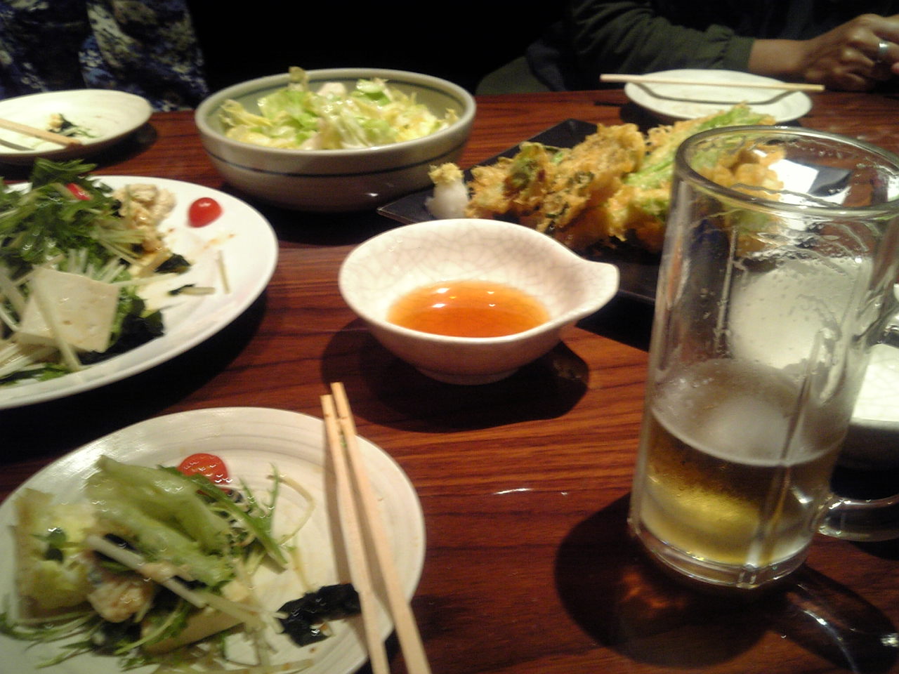 春野菜の天ぷら、豆腐と湯葉のサラダ、がっつりキャベツ(キャベツにごま油と塩コショウで味付けしたもの)、そして当然(笑)ビール