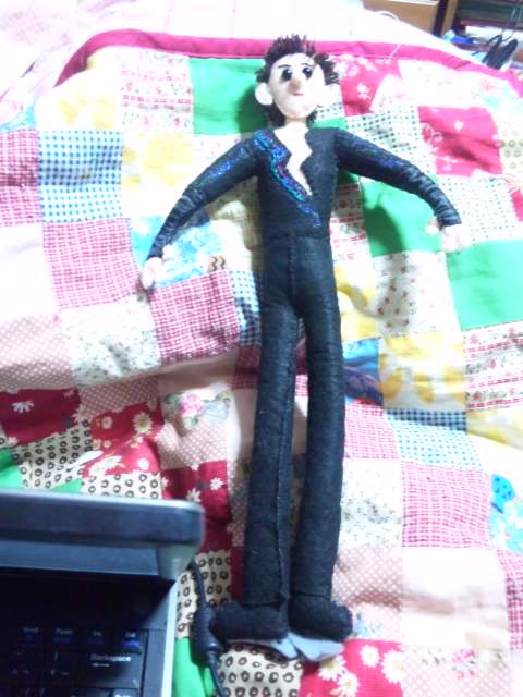これは衣装のキラキラ部分にご注目ください。この部分、結構苦労したんです~。刺繍でイナズマ部分を作った後、ラメ糊を塗って、さらに手芸用のボンドで抑えました。