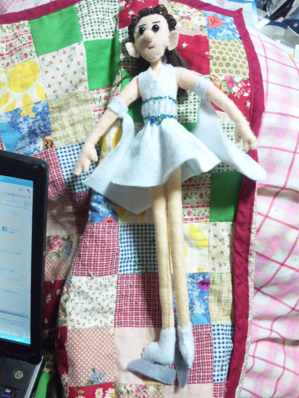 これはスカートのひらひら部分と、腕のひらひら部分をフエルトで再現するのにちょっと苦労したかな。あとはビーズとラメ糊でもってキラキラさせました♪