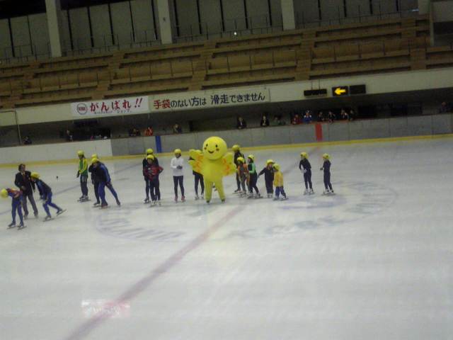 スピードスケートのエキシビションです。ちびっこたちの勇姿に歓声が上がります。はばタンも一緒に走りビリでフィニッシュ(笑)