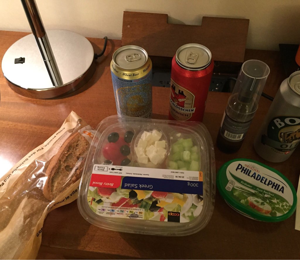 地下街にもカフェとかあるね。でもビールはコープとかの方が安いよね? 少し歩いて食料品店を探し、ビールと小さいサイズのワイン、パンとサラダとクリームチーズを購入。これだけあれば、夜食いっぱぐれても大丈夫でしょう。